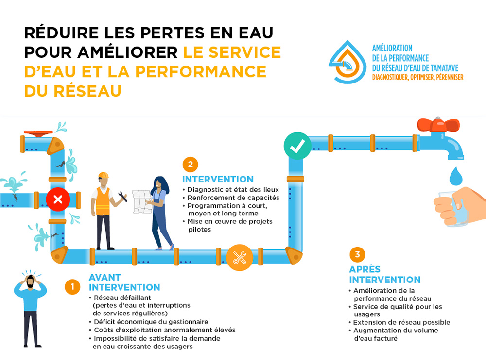 Sur la base du diagnostic mis en œuvre par les experts internationaux du groupement, le projet prévoit la co-construction d’un plan d’action opérationnel visant à améliorer la gestion et la performance du réseau d’eau potable de la ville de Tamatave.